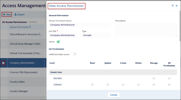- The View Access Permissions screen displays the permissions for the particular