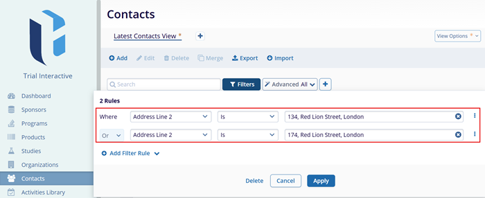 Now, if the And condition is applied, the system will display records that have both address lines i.e., 134, Red Lion Street, London, and 174, Red Lion Street, London