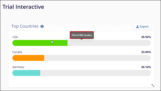 The Top Countries dashlet within the Portfolio dashboard t shows the three countries with the highest percentage of studies that include at least one site, counting each study once per country, regardless of site count.