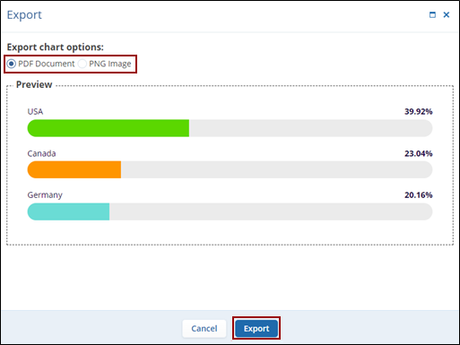- Click either on the PDF Document or PNG Image radio button from the Export Chart Options screen.