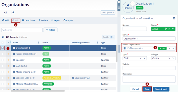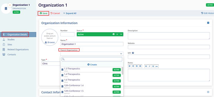 - Access the Parent Organization dropdown and associate an existing or create a new parent organization.