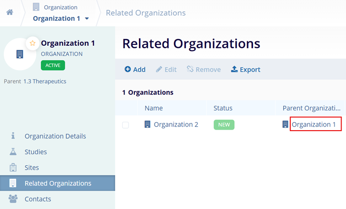 - Locate the organization to associate a parent organization with and click on the organization’s name.