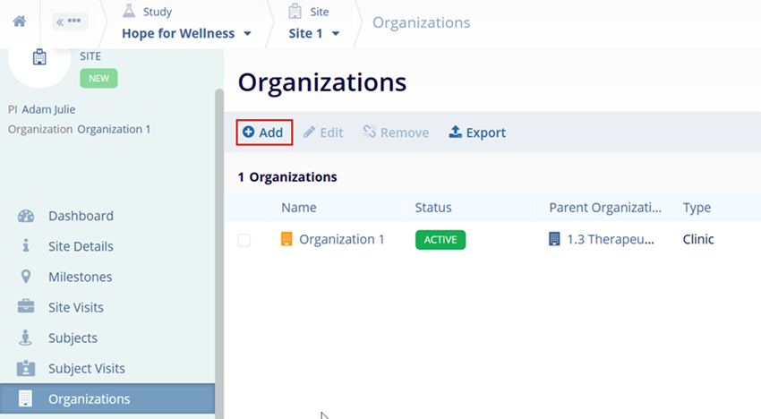 - Navigate to the Site to associate an organization with.