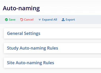- Make the required edits to the General Settings, Study Auto-naming Rules, and Site Auto-naming Rules.