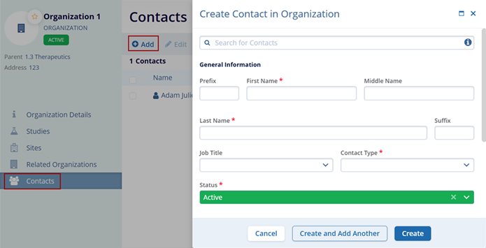 - Add the necessary information to the mandatory fields on the ‘Create Contact in Organization’ form.
