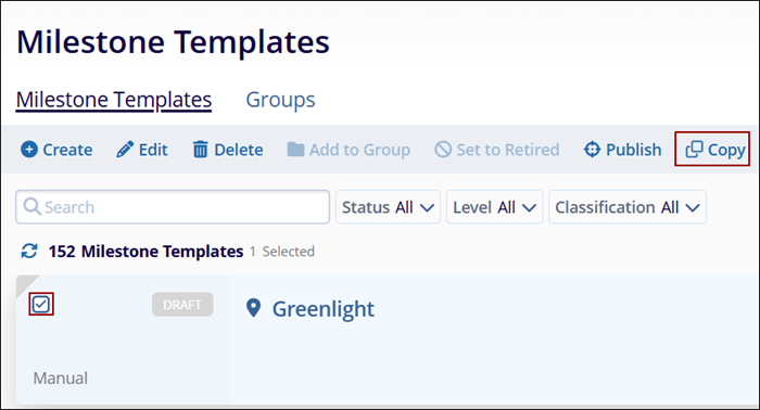 Note: The milestone templates with Draft and Published status can be copied, only one at a time.