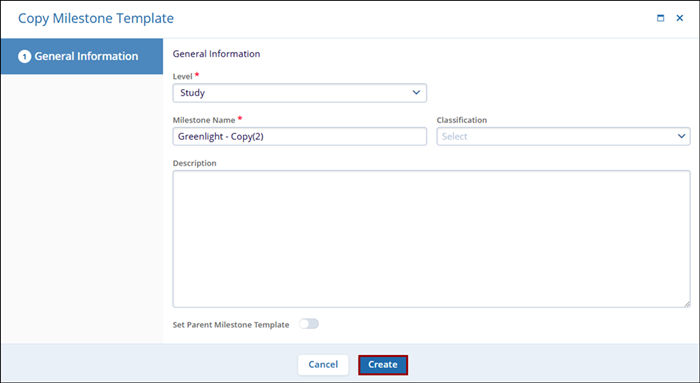 - On the Copy Milestone Template screen, click on the Create button.