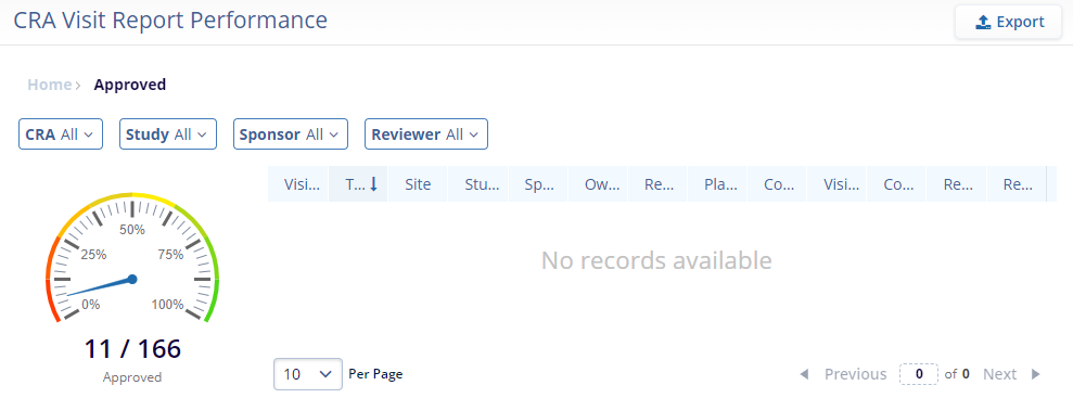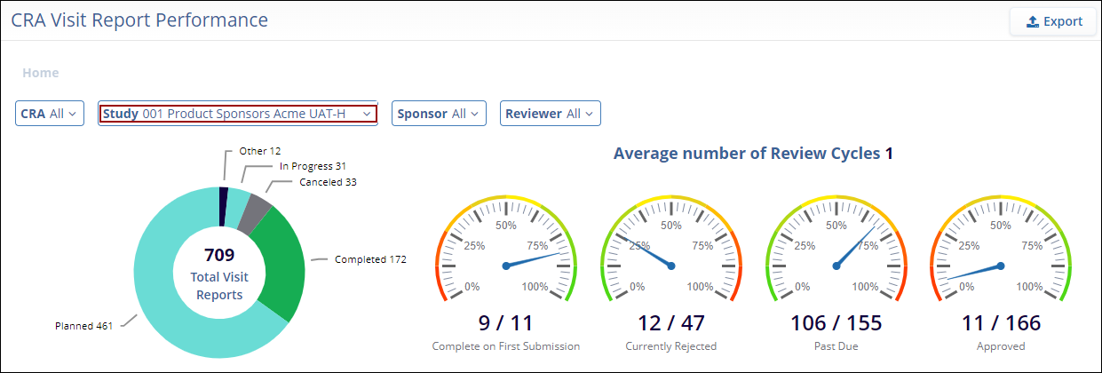 - Filter performance metrics by study, reviewer, CRA, or sponsor