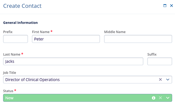 Status*: Select the status of the contact from the dropdown menu. A tooltip