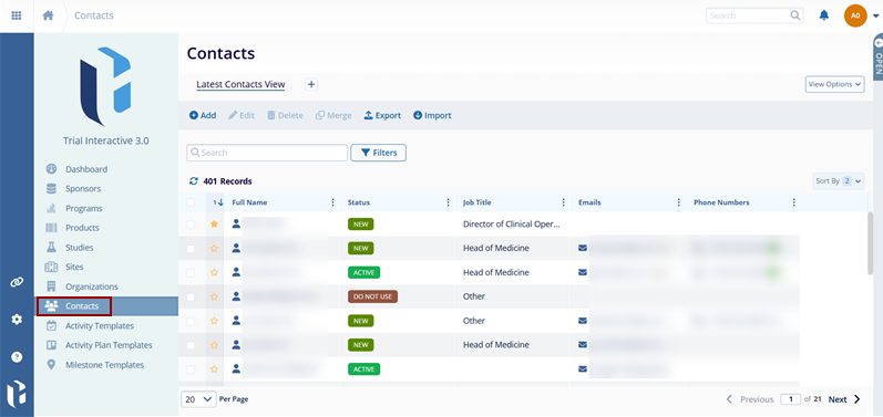 - From the left-hand navigation links, select Contacts.The Contacts screen