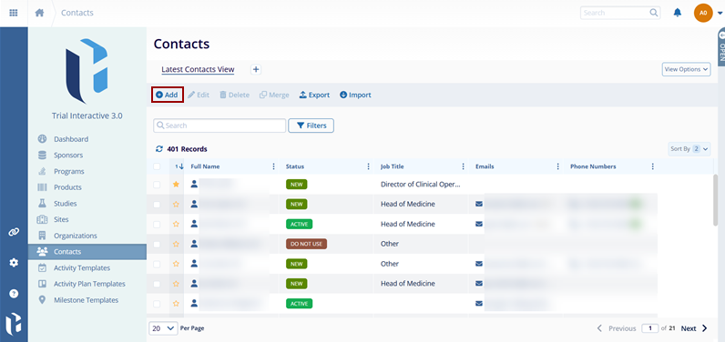- Click on the +Add button on the top menu bar from the Contacts screen.