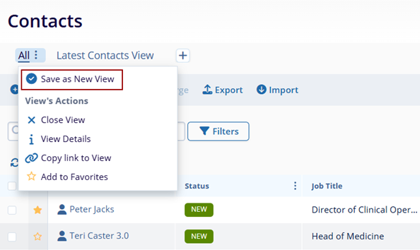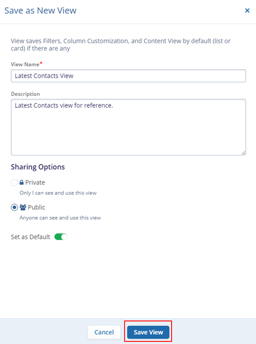 - On the ‘Save as New View’ screen, specify View Name, Description, and Sharing Options-Private or Public. For the ‘Public’ option, it is possible to set it as a default view by enabling the Set as Default toggle button.