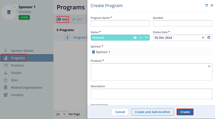- On the Sponsor Details screen, click on the Program link from the left-hand Navigation menu.