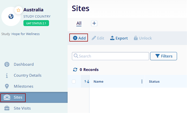 - Click on the Sites link in the Navigation menu on the left side of the screen.