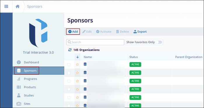 - From the left-hand navigation links, select Sponsors. The Sponsors screen opens where all sponsors at the global level are displayed.