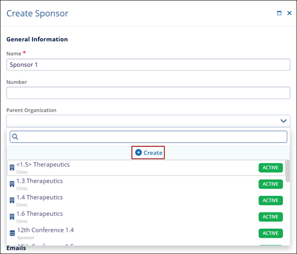 - Parent Organization: To add an existing organization to the sponsor, click on the drop-down arrow and select the appropriate organization from the list. To create a new organization, click on the +Create button.