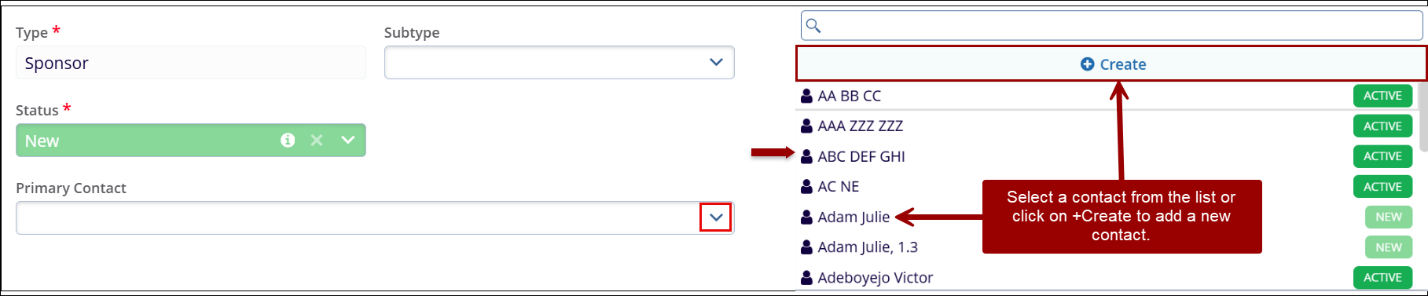 - Primary Contact: To add a contact to the sponsors, click on the drop-down arrow and select the appropriate Contact from the list. To create a new contact, click on the +Create button.