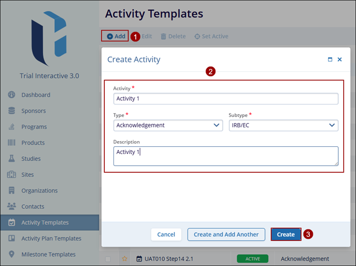 - On the Activity Templates screen, click on the Add button in the top-left of the screen.