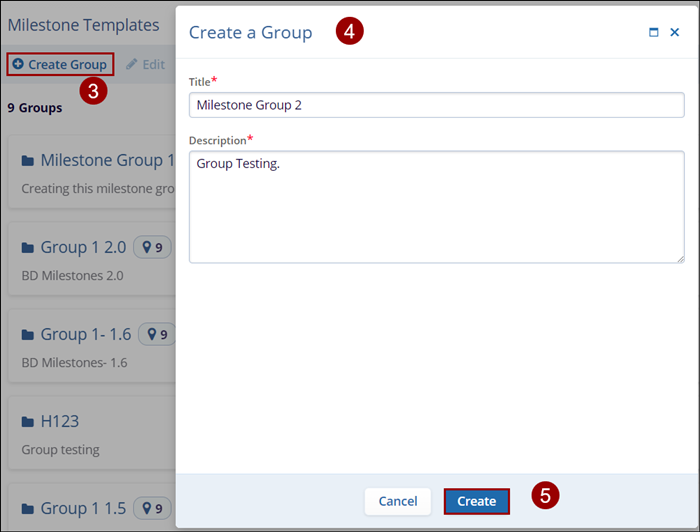 To create Milestone Groups, follow the steps below. Refer to the screenshot and steps for the sequence.