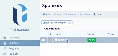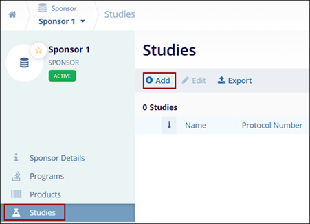 - On the Sponsor Details screen, click on the Studies link from the left-hand Navigation menu.