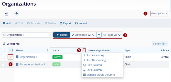 - Filters: Refer to the Filters section to apply standard and advanced filters to the ‘Organizations’ screen.