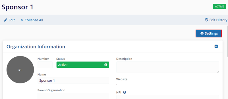 - On the Sponsor Details screen, click on the Setting button in the top-right of the screen.