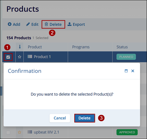 - On the Confirmation popup, click on Delete to confirm the product deletion.