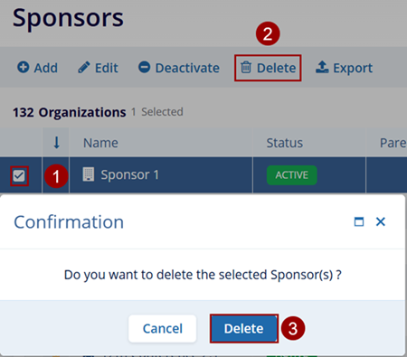 Deleting a Sponsor To delete a sponsor, follow the steps below: Select a sponsor by clicking on the checkbox. Click on the Delete button. On the confirmation popup, click on the Delete button.