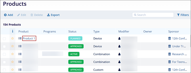 - From the left-hand navigation links, click on the Products. This opens the Products screen with a list of existing products.