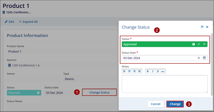 - On the Change Status screen, update the Status*, and Status Date* and enter notes if required.