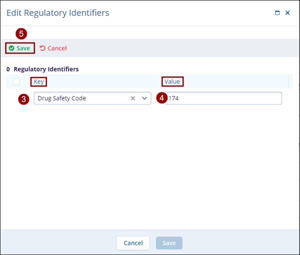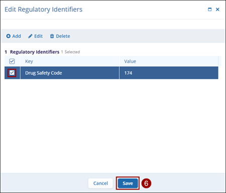 - Click on the checkbox for the newly added Regulatory Identifier and click on Save.
