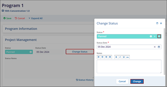 - On the Change Status screen, update the Status*, Status Date* and enter notes if required.