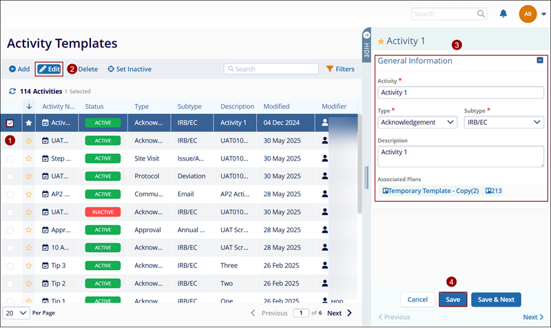 - Navigate to the activity name to edit and click the check box of the activity name.