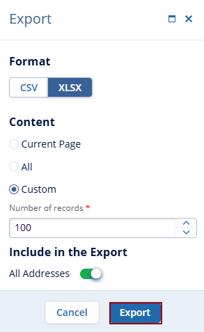 Include in Report: Click on the All Addresses toggle button to include addresses in the exported file.