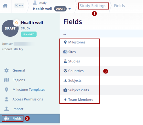 - On the Study Settings screen, click on the Fields option from the left-hand navigation pane.