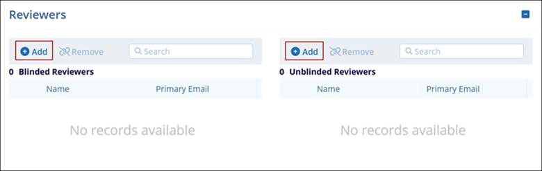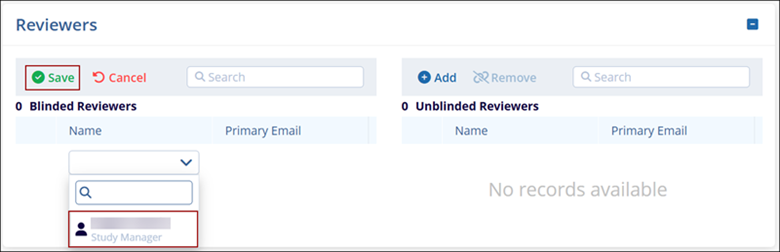 Reviewers are members of the study team responsible for reviewing, approving, or rejecting site visit reports. They must be assigned before any reports can be generated for the study. Within the Reviewers section, users can designate both blinded and unblinded reviewers. A single user may serve as a blinded or unblinded reviewer, but the user must be separately added in the Blinded and Unblinded Reviewers section.