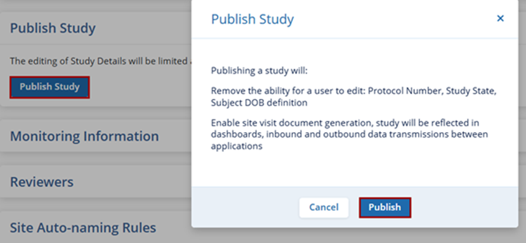 The Publish Study section allows users to publish a study in a draft state. To publish a study, click on the Publish Study button. On the confirmation popup click on the Publish button. Once the study is published, users cannot edit study information like Protocol Number, Study State, and Subject DOB definition.