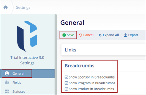 To configure the breadcrumbs, go to the Breadcrumbs section under General Settings, select or clear the desired checkboxes to adjust breadcrumb visibility, and then click the Save button.