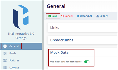 The General Settings section allows Admin users to define links, breadcrumb performance, and the display of mock data.