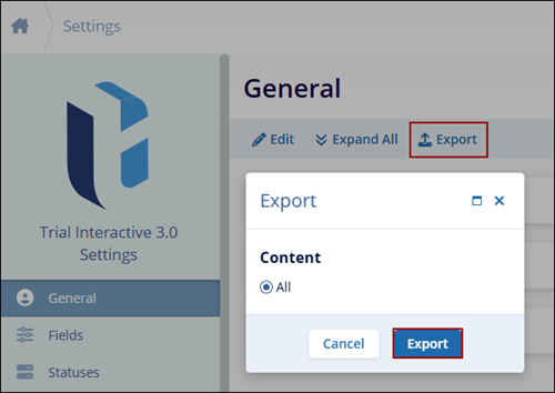 - Click on the Export button on the ‘Export’ popup to download a XLSX file with the General setting details.