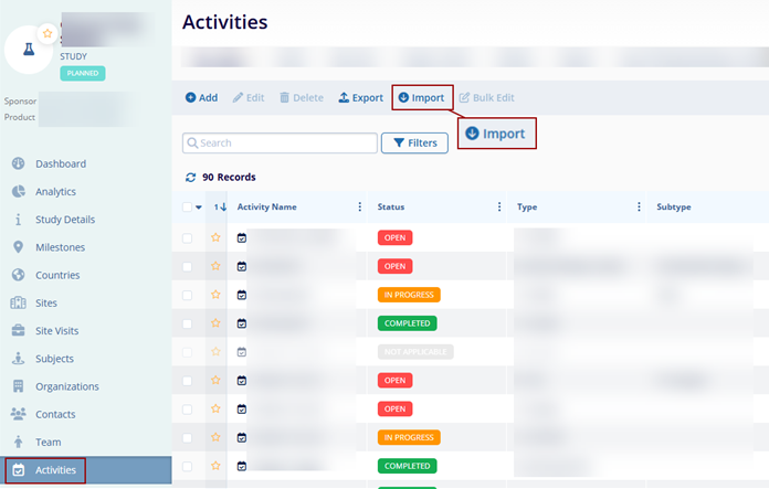 - Choose the level at which the activity should be imported i.e., Study, Study Country and Site.