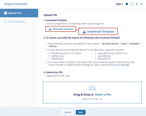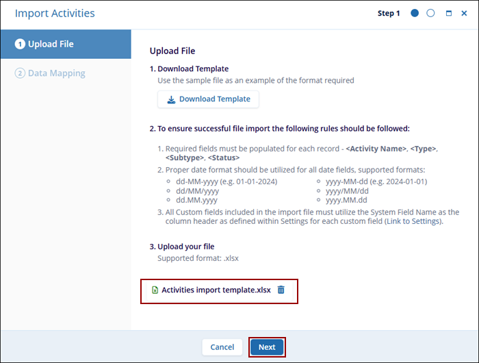 - Upload the template file in XLSX file format by using the Drag & Drop or manual