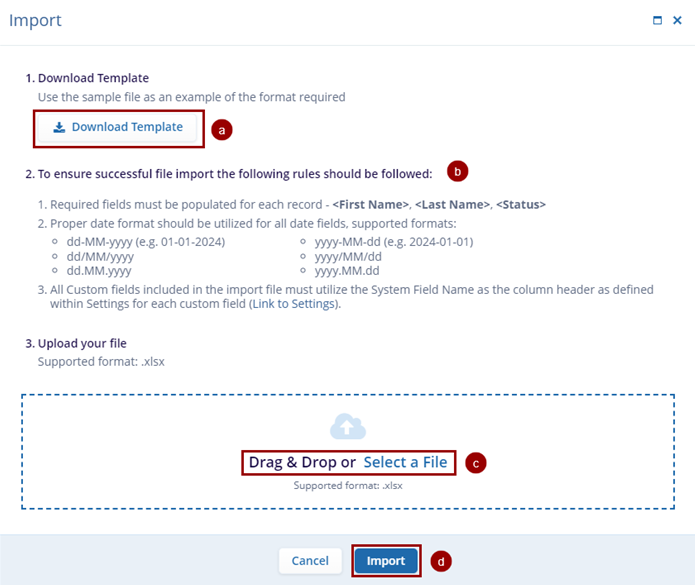 - Upload the file in .xlsx file format either by selecting the file or using the Drag & Drop functionality.