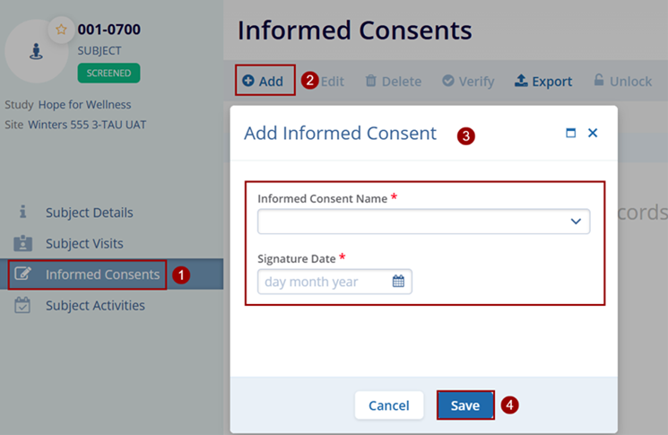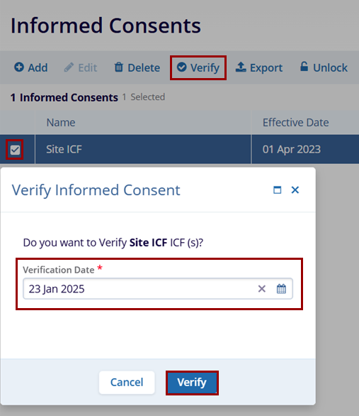- On the ‘Verify Informed Consent’ popup enter the Verification Date*