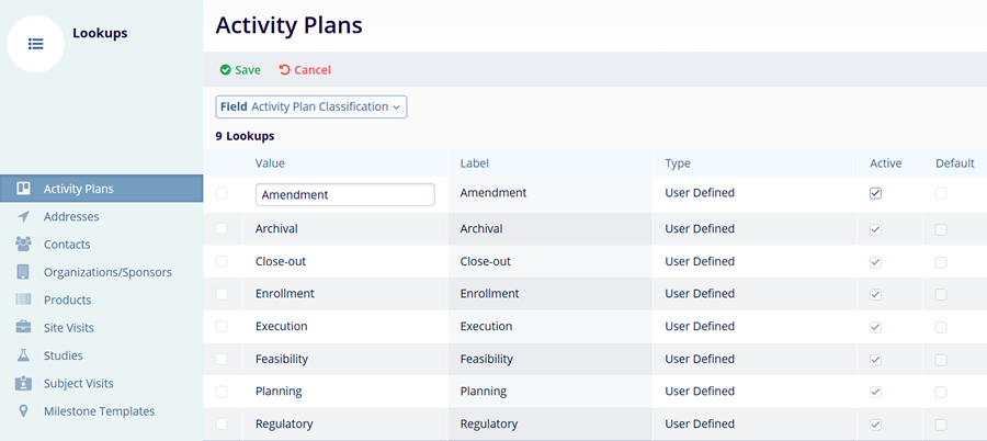 The term Lookups refer to the options found in various dropdown menus throughout the system. If the group is upgrading to a new version of CTMS which includes additional standard values, to avoid impacting current study data, these values will be added in an inactive status and will need to be manually updated if desired.