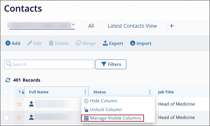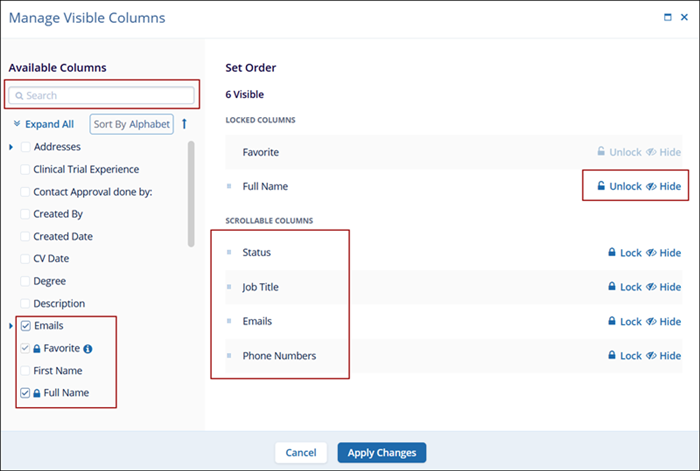 - Click on Unlock or Hide in the Locked Columns section so that the corresponding actions will be reflected on the main Contacts screen.
