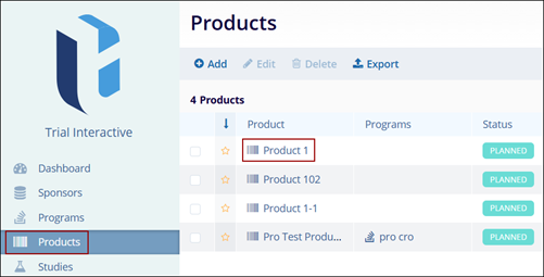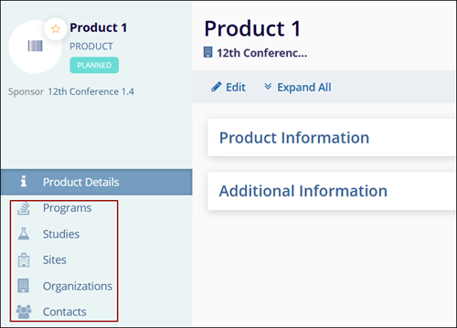 Users can add Programs, Studies, Sites, Organizations and Contacts at a product level by accessing the Product Details screen.