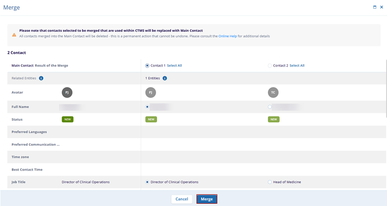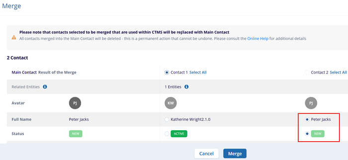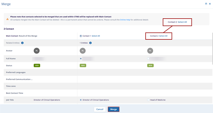 - To merge specific details from Contact 2, click on the individual radio button for