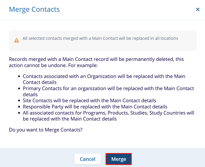 - Once the user selects Merge, the Merge Contacts confirmation popup displays certain actions that cannot be undone and prompts the user to read those before confirmation. (Refer to the image below to read all actions that cannot be undone)