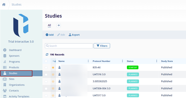Studies screen with a list of existing studies in CTMS.